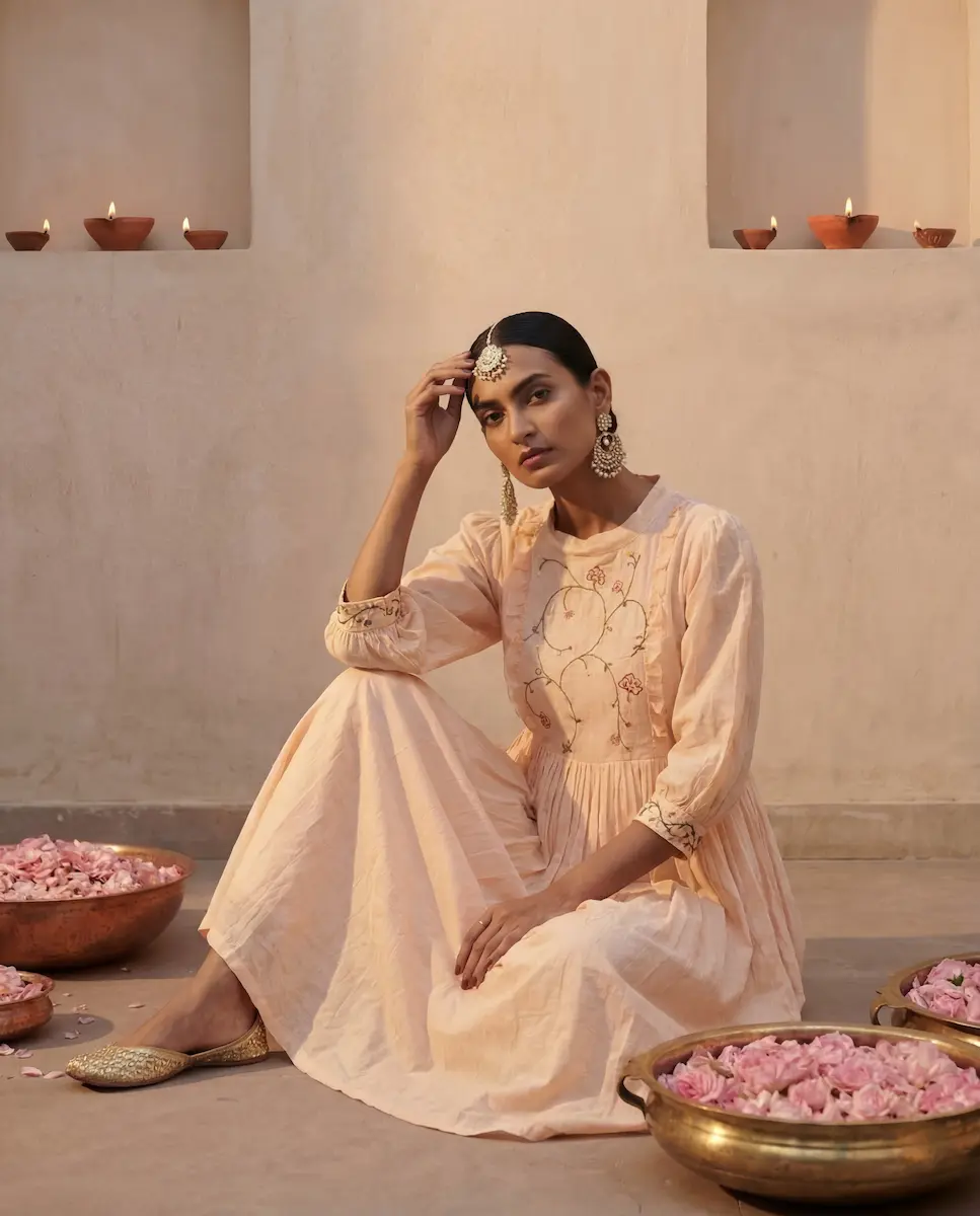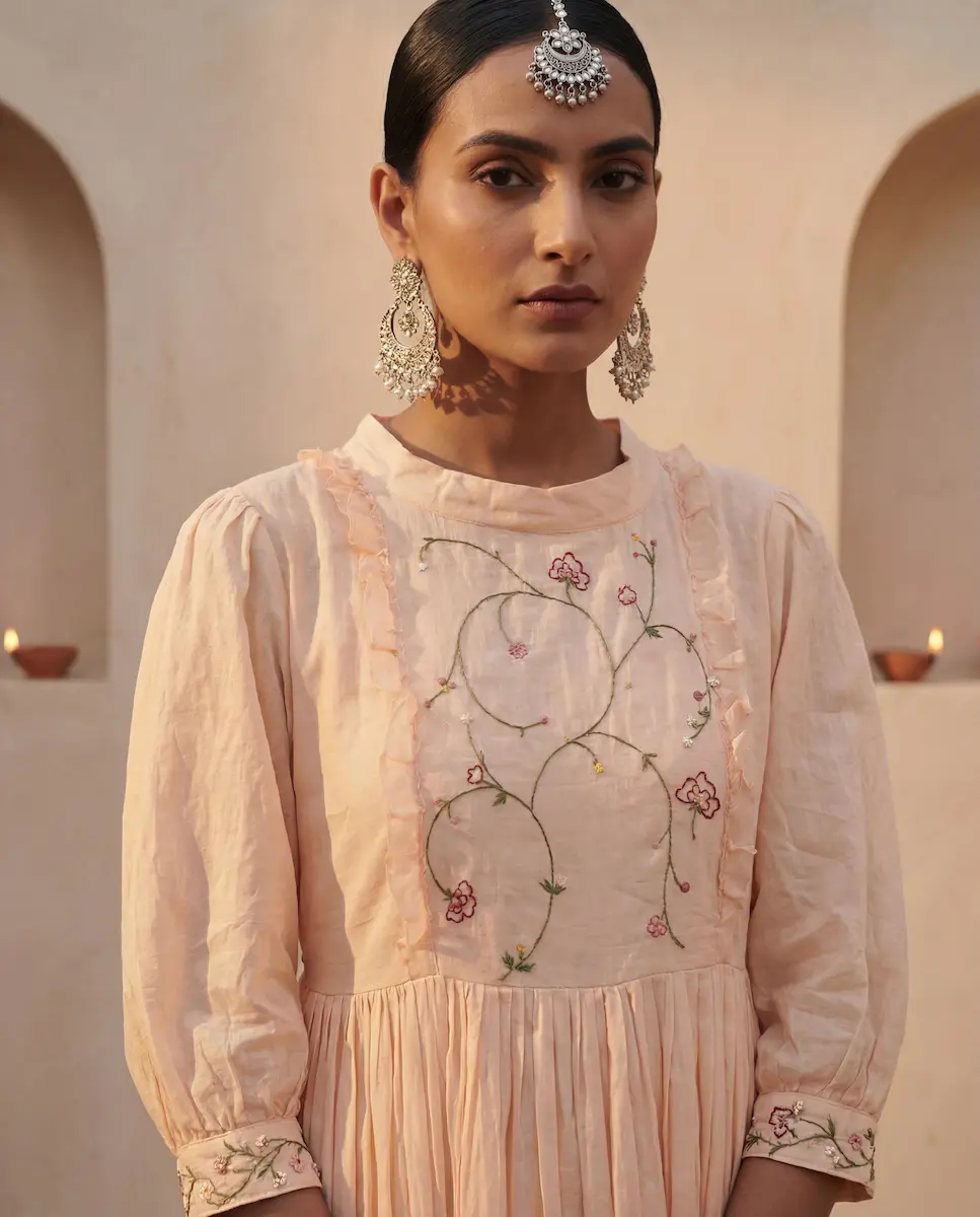 A soft mul cotton midi dress in baby peach, inspired by the Taj Mahal’s morning glow and finished with delicate Taj-inspired embroidery.