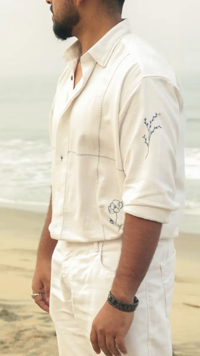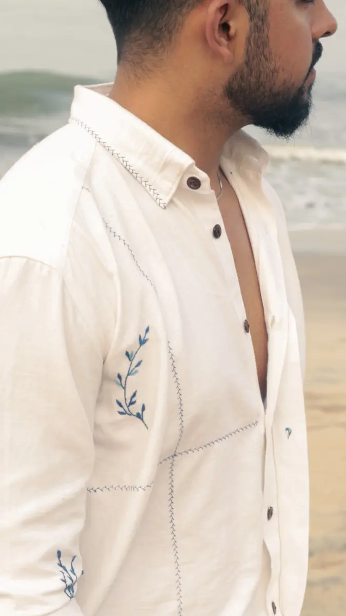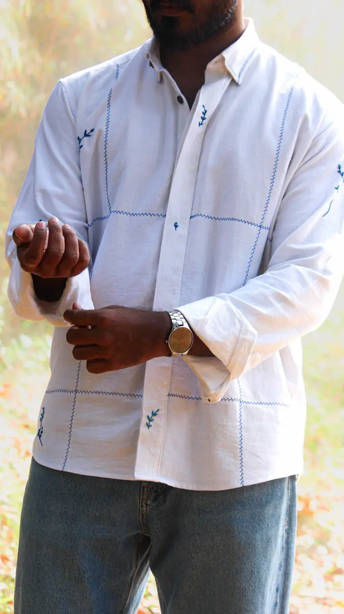A handwoven khadi unisex shirt featuring moonlight-inspired blue Taj motif embroidery. Breathable, elegant, and crafted for timeless everyday wear.